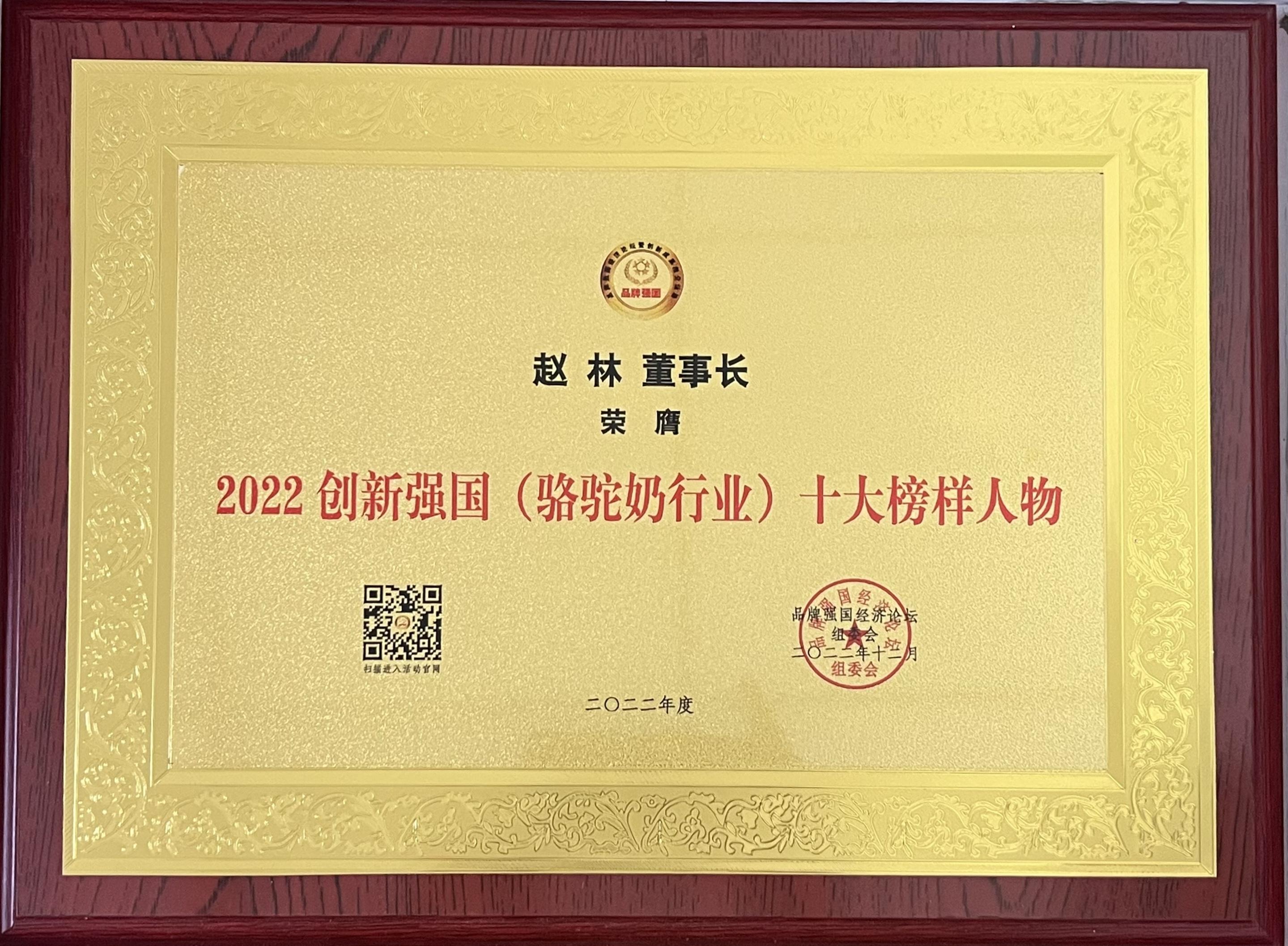 在“2022 品牌強國經濟論壇暨(第六屆)創新成果推介活動”上,新疆新駝乳業有限公司憑借在駱駝奶行業的影響力和品牌綜合實力,榮獲“2022 品牌強國(駱駝奶行業)十大創新力企業”稱號、董事長趙林榮獲“2022 創新強國(駱駝奶行業)十大榜樣人物”稱號。