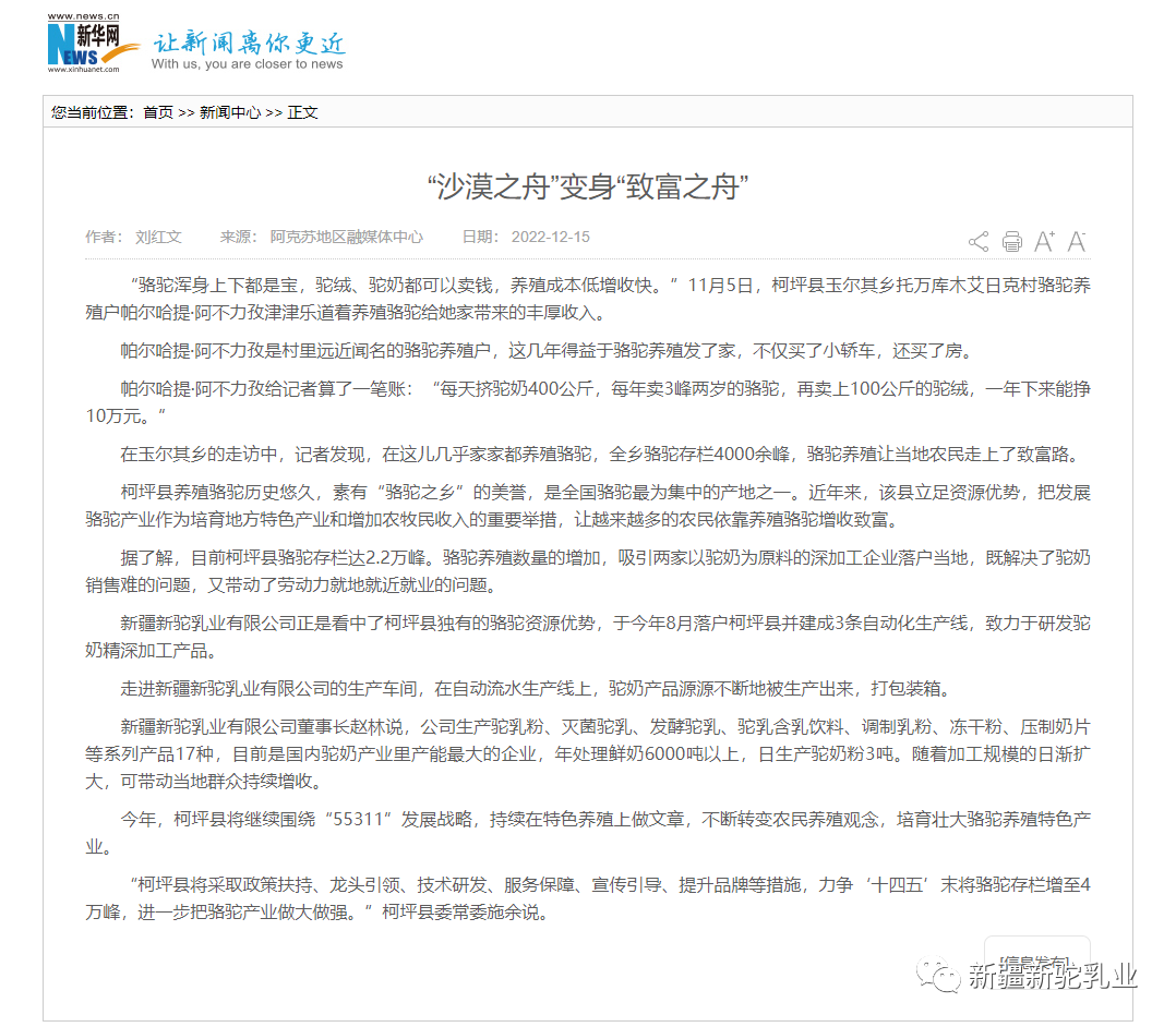 近日、新疆衛視漢語、新疆二套維吾爾語、三套哈薩克語并機直播的《新疆新聞聯播》、中央廣播電視總臺央視頻、新華網等主流媒體,紛紛對新駝乳業獲得“優質柯坪”認證(這是新疆地區人民政府建立的第一個鄉村振興區域品牌)進行報道,熱度持續上升!